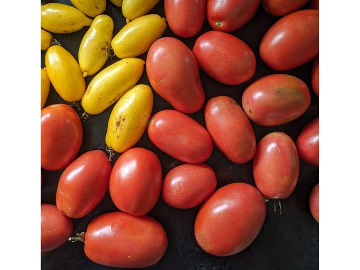 2023 tomatoes on the left, blossom-end rot tomatoes from 2022 on the right.
