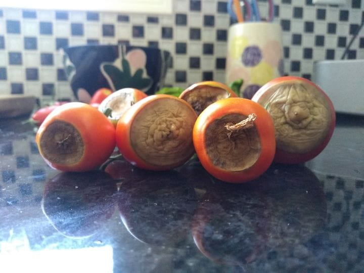 Some of my tomatoes from 2022 suffered from blossom end rot, which is a plant issue resulting in brown, bruised-looking fruit ends. The problem starts because of a calcium deficiency in the plant, but isn't necessarily related to low calcium levels in the soil. Blossom end rot often has more to do with consistent watering, which affects the plant's ability to take up calcium.